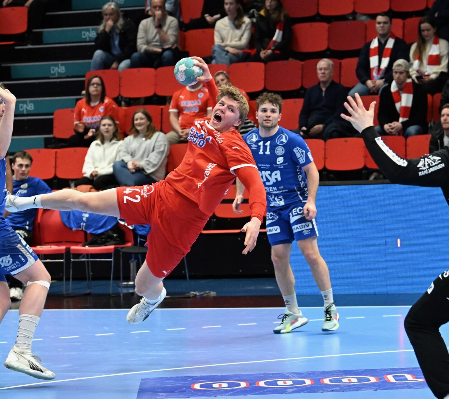 DHK -spillerne merket på kroppen at de hadde møtt et fysisk sterkt Runar-lag denne onsdagskvelden. Her treffer Viktor Petersen Norberg på Tord Lea Knutsen (t.v.) og Tobias Rivesjø.