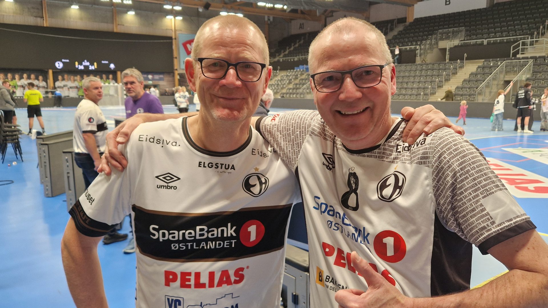 Duoen har god grunn til å smile. Etter Elverums seier mot Sandnes leder de hvite og sorte REMA 1000-ligaen, tre poeng foran Kolstad. Noe som gir et lite overtak i gullkampen. Mange trodde nok at luka mellom Elverum og Kolstad skulle være på ett poeng før de to gigantene møtes på lørdag. Men det var før Elverum fikk hjelp av erkerival ØIF Arendal på tirsdag. Og Norstrøm og Østenengen må innrømme at de var bittelitt ØIF Arendal-supportere tirsdag kveld.