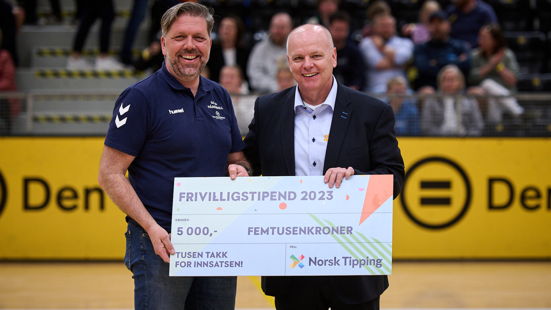 Det er Norsk Topphåndballs kommersielle leder Bjørn-Gunnar Bruun Hansen som, på vegne av Norsk Tipping, har tatt turen til Åsenhallen for å dele ut et frivilligstipend til Sola. Og som også skryter av den suksessfulle håndballklubben.