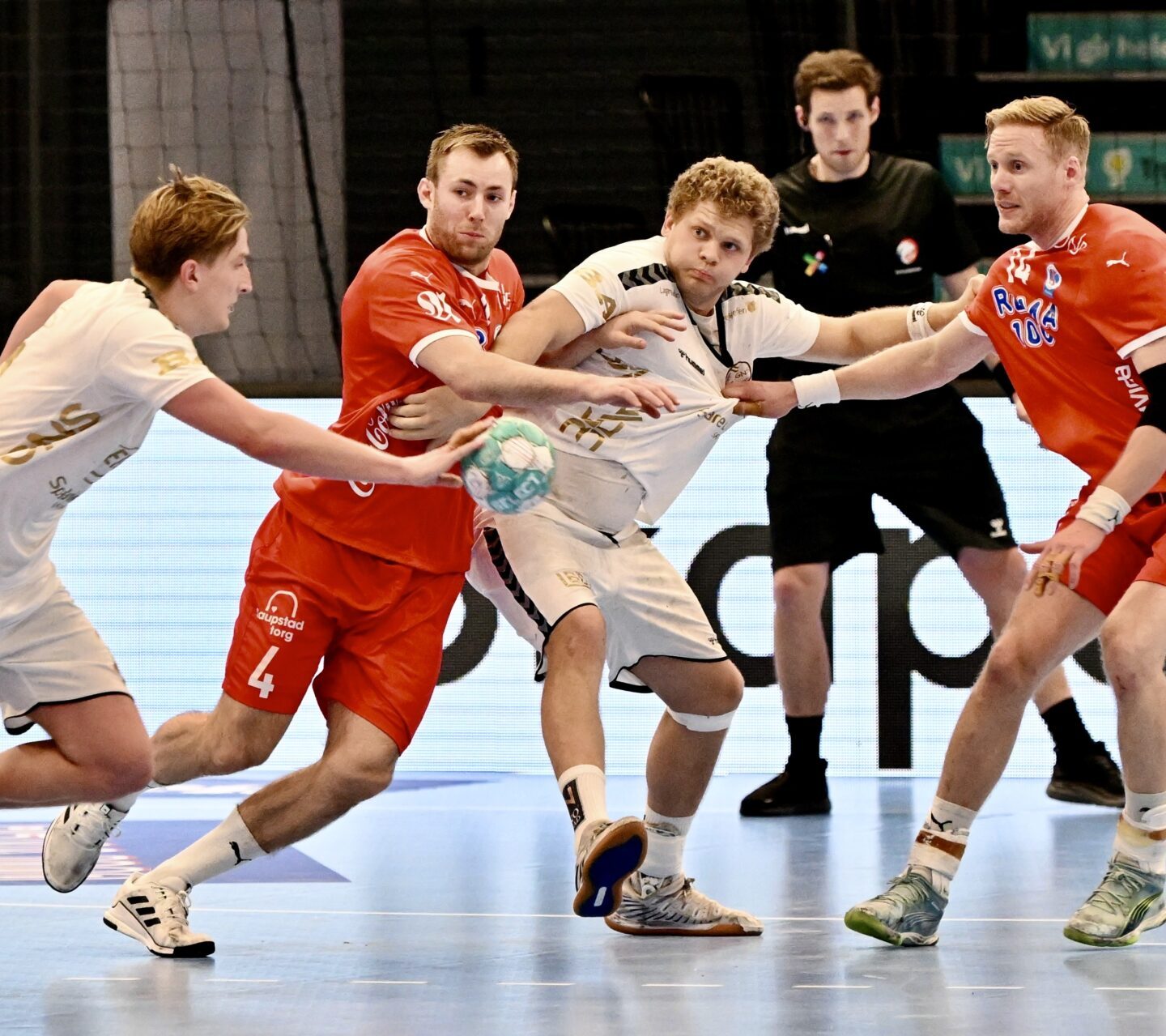 Midtveis i førsteomgangen hadde dommerparet delt ut ikke mindre enn seks to-minuttere – deriblant 2×2 til Magnus Gullerud, Simen Lyse hadde hamret inn fire mål og Kolstad hadde satt inn 11 mot vertenes 7 mål. TV2-kommentator Harald Bredeli undret seg over antall spillere på banen: