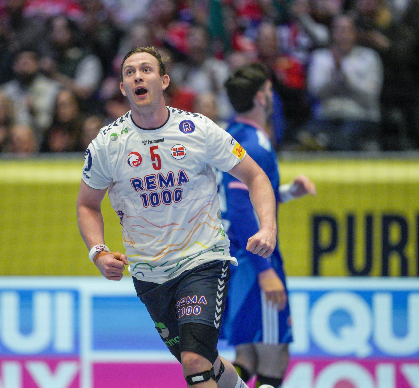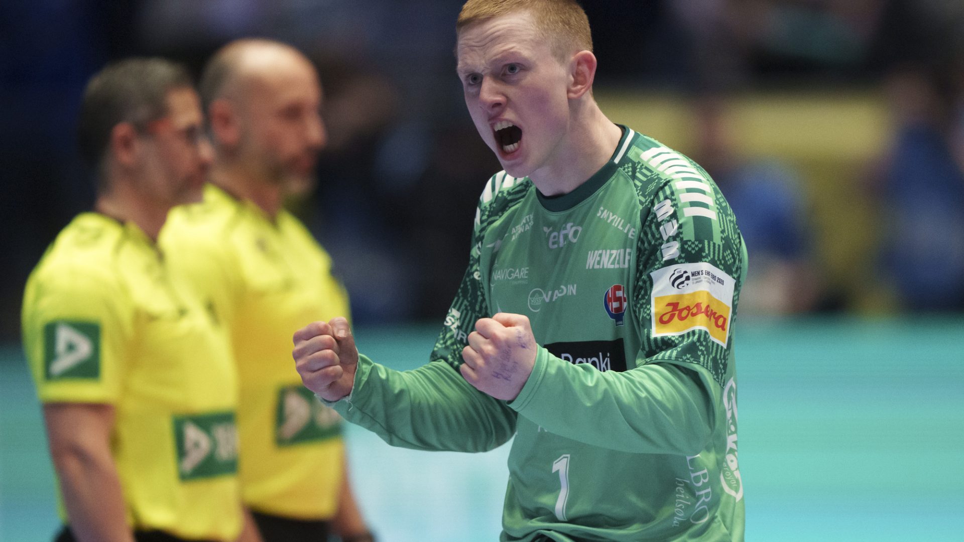 Færøyenes Pauli Jacobsen under EM-kampen i håndball mellom Montenegro og Færøyene i Unity arena. Foto: Cornelius Poppe / NTB