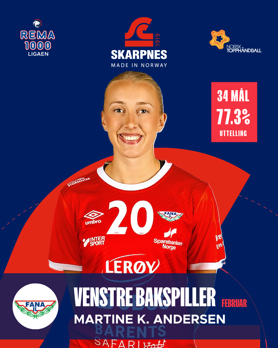 34 mål på fire kamper gir et snitt på 8,5 scoringer per kamp. Med en uttellingsprosent på 77,3 og hele 17 assist har Martine Kårigstad Andersen vært både effektiv og skapende. Et MEP-snitt på 5,7 understreker en dominerende måned fra venstre bak.