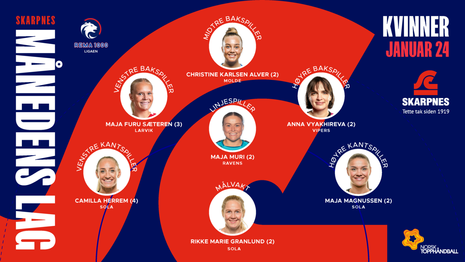 Allerede 3.januar var REMA 1000-ligaen igang i 2024, og gjennom hele januar ble det kjempet om nye poeng. Etter januars 35 kamper er det klart å presentere hvilke spillere som får plass på Skarpnes Månedens lag Kvinner i januar